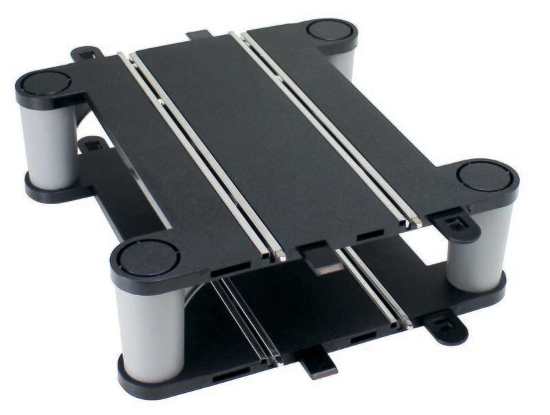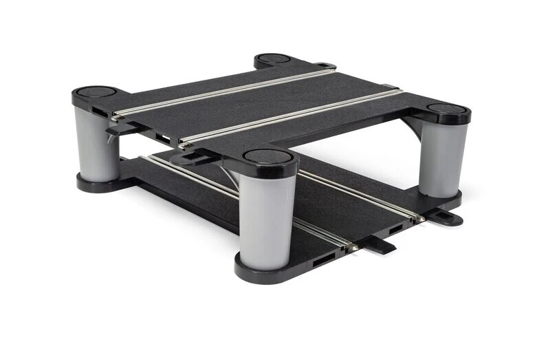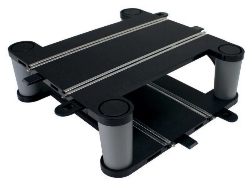 The elevated track crossover section comes as 2 x three-quarter length track sections with pillars. This assembly helps build a more rigid fly-over section than fly-overs supported simply by pillars. Multiple C8295 crossovers can be stacked on top of each other to build crazy stunt or action tracks. With the addition of two C8207 half straights, this bridge can replace a C8210 flat crossroad track section – converting a circuit with a crossroad to a figure-of-eight layout for even more fast-paced Scalextric action!